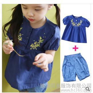 夏款新品童套裝 繡花短袖襯衫+水洗牛仔布燈籠褲**