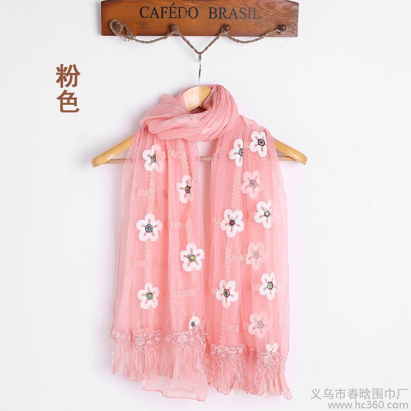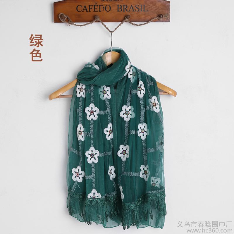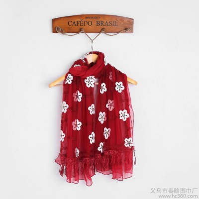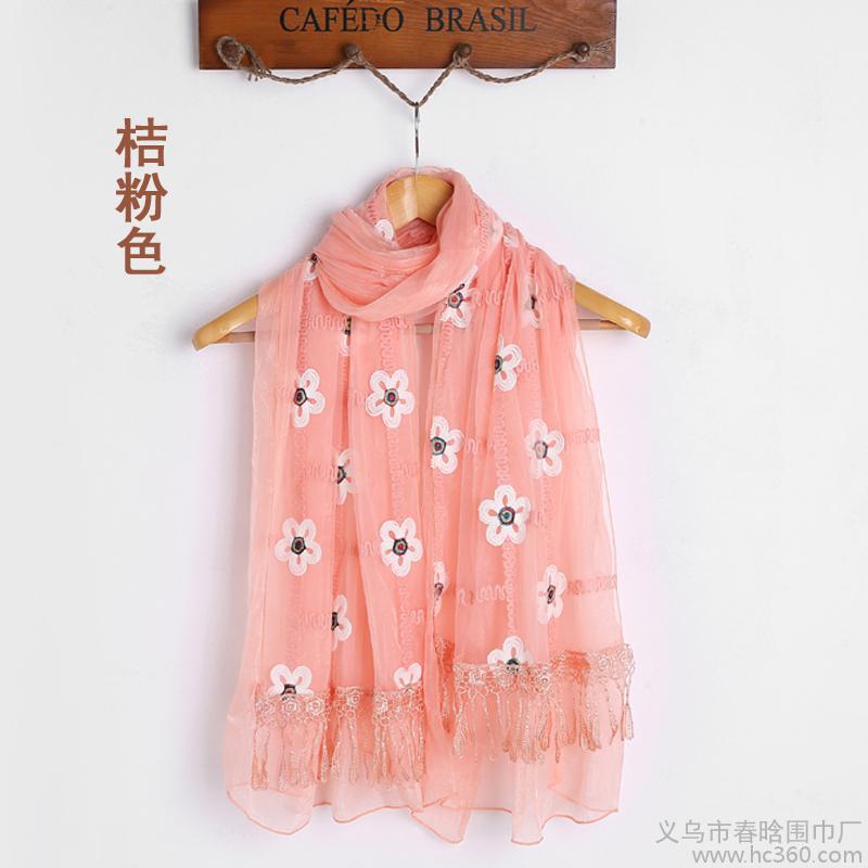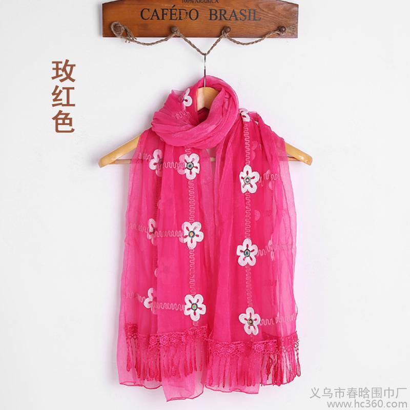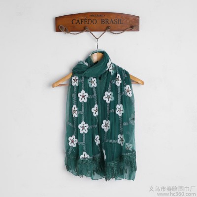 絲巾批發刺繡格子梅花裝飾絲巾加長流蘇圍巾**