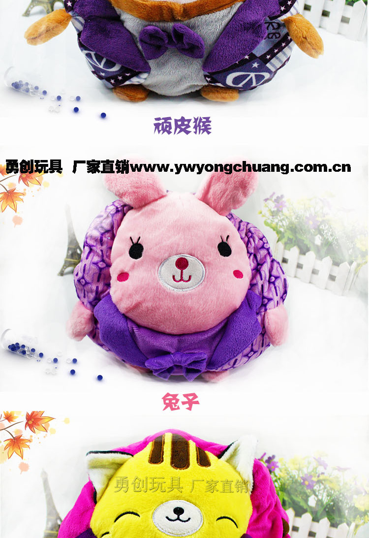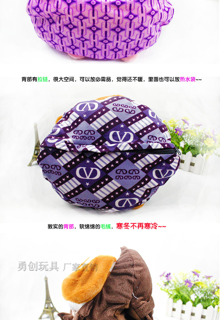 【描 述】:卡通造型設計,戴著領結,非常卡通可愛,采用**毛絨,顏色搭配鮮艷,做工精致!后面有帶拉鏈,里面可以放熱水袋,電暖寶或錢包,手機等雜物,非常實用。