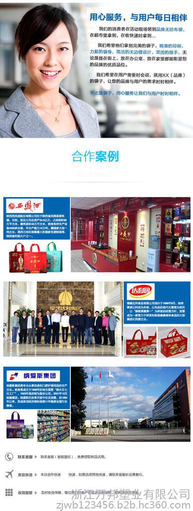 【印刷工藝】提供水印,絲印、熱轉印、機印、燙金、燙銀,色彩漸變,裁片印花、熱固油墨印花、轉移印花、膠漿印花、多色套印花、色澤度、,顏色鮮艷飽和、圖案逼真;?在印刷油墨的選用上選擇不掉色環保膠漿和油墨的絲網印刷、燙畫、刺繡、燙金等特殊效果,能將一般的環保袋做出令人愛不釋手的感覺。可以根據你的需要任意選擇!