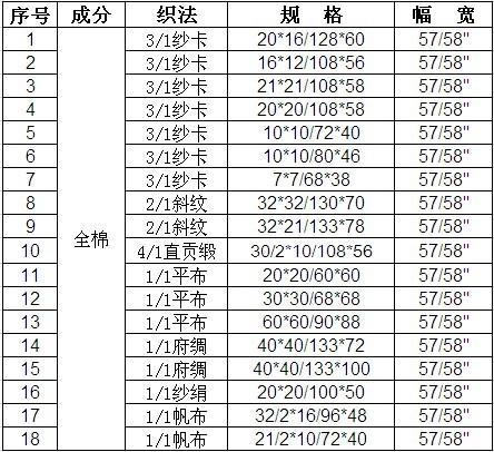 全棉類面料請參考以下表格,僅為部分常規(guī)品種,更多規(guī)格請參考站內(nèi)其他信息,或聯(lián)系我們,可協(xié)助客戶完成前期坯布定織。