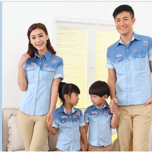 夏季親子裝新款短袖牛仔襯衣家庭裝 品牌親子裝夏裝全家裝代發貨