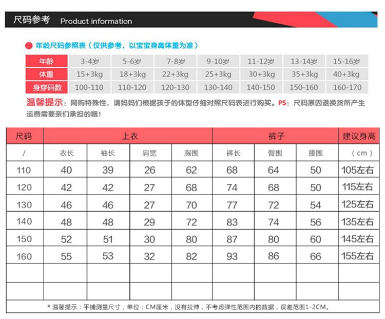 適合身高 | 110碼--100cm,120碼--110cm,130碼--120cm,140碼--130cm,150碼--140cm,160碼--150cm |