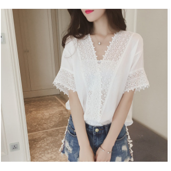 2017夏季韓版新款寬松白色蕾絲雪紡衫女短袖純色鏤空V領雪紡上衣