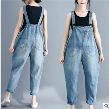 實拍背帶牛仔九分褲女夏胖妹妹大碼寬松減齡吊帶連體褲