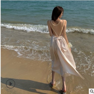 沙灘連衣裙夏新款ins網紅炸街氣質高腰蝴蝶結珠鏈性感露背中長裙
