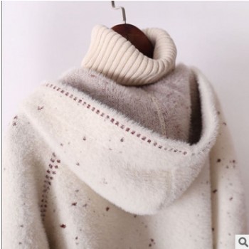 2018秋冬仿水貂絨毛衣外套女新款中長款雪花寬松連帽大衣針織開衫