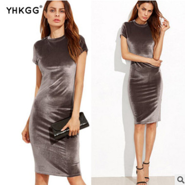 2017新款 歐美時尚純色天鵝絨圓領(lǐng)修身鉛筆裙