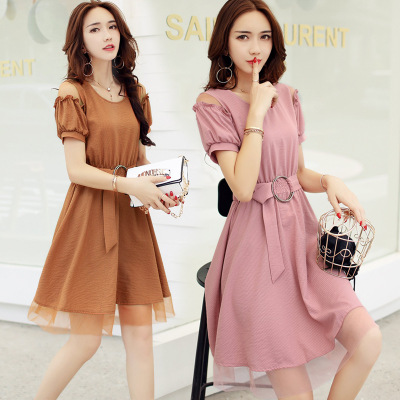 2018夏季新品圓領短袖純色拼接中長款女式甜美連衣裙 新實拍