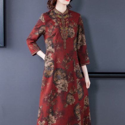 2021春季仿真絲香云紗連衣裙女長袖桑蠶絲年輕媽媽裝中長款顯瘦