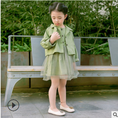 女童軍綠色背心網紗蓬蓬連衣裙+短外套套裝 韓版紗裙套裝女童