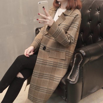 2018秋冬季女裝新款韓版時尚格子中長款西裝領針織開衫大衣外套女