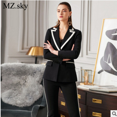 春季新款黑白撞色西裝套裝女氣質修身職業微喇叭西服兩件套