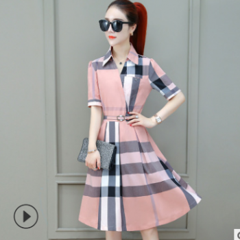 2019新款夏季棉質V領襯衫裙短袖氣質格子收腰顯瘦連衣裙女中長裙