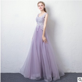 禮服裙女2019新款紫色高貴雙肩V領(lǐng)晚宴長款聚會(huì)伴娘主持人晚禮服