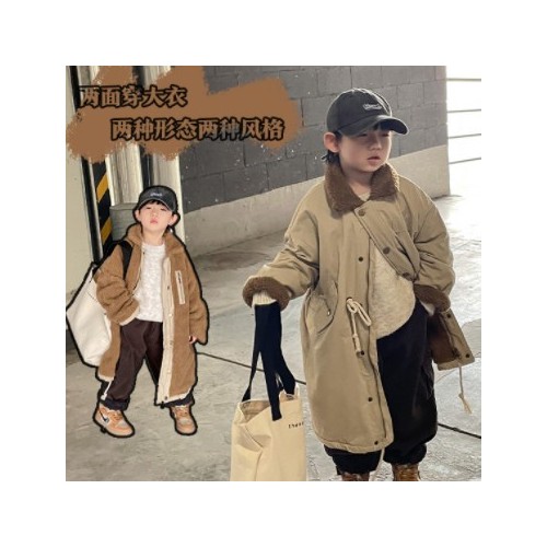 兒童長(zhǎng)款外套2021冬季男童加絨正反兩穿大衣女孩毛毛衣韓版洋氣潮