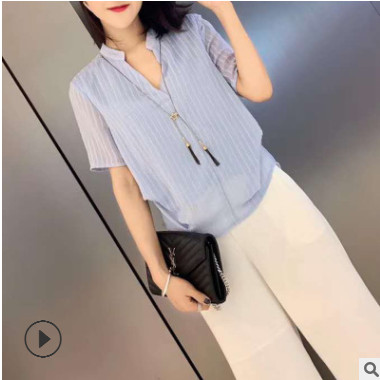 雪紡衫女2019新款短袖V領上衣寬松顯瘦條紋襯衣女洋氣小衫配項鏈