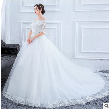 2020新款婚紗禮服 簡約白色韓式新娘一字肩中袖修身顯瘦拖尾婚紗