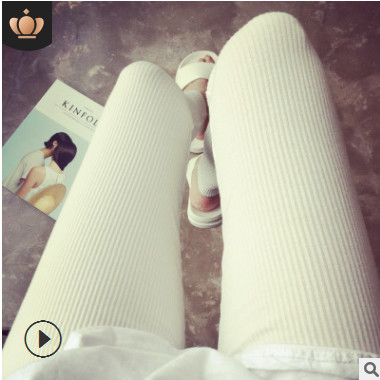跨境專供秋季打底褲女外穿薄款九分褲螺紋小腳褲純棉顯瘦豎條紋長