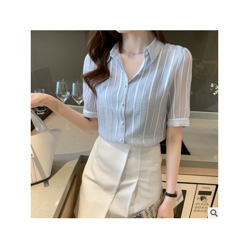 實拍藍色條紋襯衫女2021年新款夏季寬松長袖雪紡襯衣薄~送吊帶