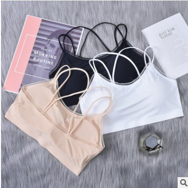夏季冰絲貼膠無痕裹胸聚攏少女小背心美背交叉肩帶文胸胸墊可拆卸
