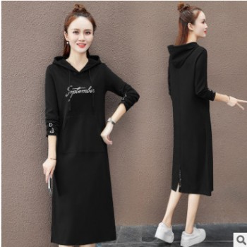 時尚休閑衛衣裙女春季2020新款寬松連帽衫過膝長款連衣裙字母刺繡