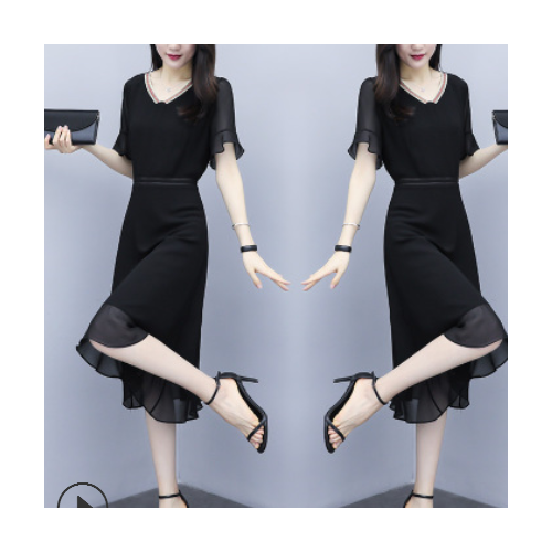 雪紡連衣裙女2021夏季新款韓版高端氣質小矮個子收腰顯瘦小黑裙子