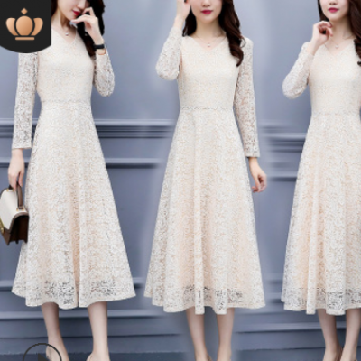 春秋長袖蕾絲V領連衣裙中長款2021新款秋裝女顯瘦裙子氣質長裙秋