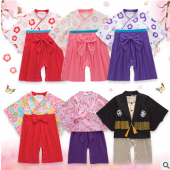 跨境童裝女童夏季長袖嬰兒連體衣服 蝴蝶結哈衣日式爬服印花和服