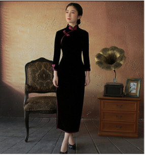 絲絨旗袍 秋季媽媽裙中式茶人服 立領七分袖長款婚宴晚禮服