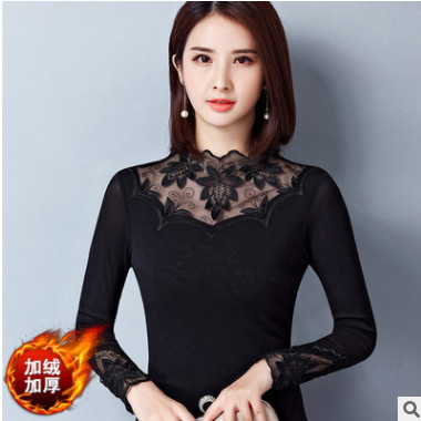 加絨保暖網紗打底衫女長袖t恤秋冬2017新款大碼加絨蕾絲衫女小衫