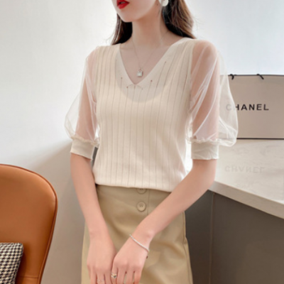 2021年夏新款韓版修身上衣v領打底衫中袖t恤女冰絲針織衫