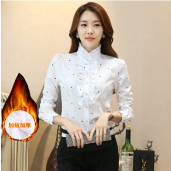 來樣定做 新款荷葉花邊長袖白色雪紡襯衫女 立領職業裝修身打底衣