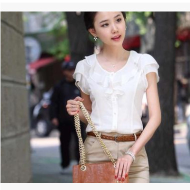 加工定制女裝夏裝韓版打底寬松顯瘦荷葉袖蕾絲短袖雪紡衫上衣女夏