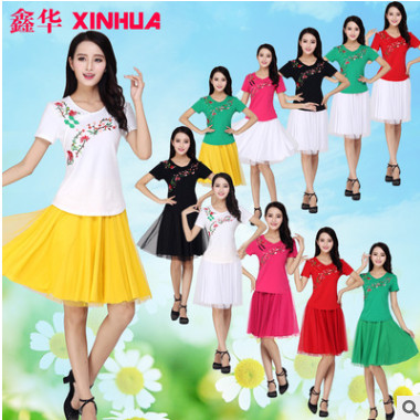春夏新款廣場舞蹈服表演服裝萊卡棉繡花大碼女裝團購定做