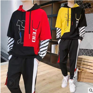 2019秋季新款潮牌街頭嘻哈男士休閑套裝拼色青少年時(shí)尚套裝潮男裝