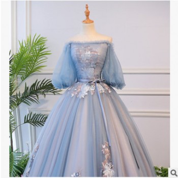 彩紗演出服舞臺裝藝考演出服舞臺獨唱影樓攝影蓬蓬裙一字領泡泡袖