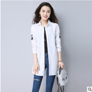 2019秋裝中長款長袖修身紐扣口袋拼接繡花單排多扣POLO領