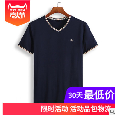 夏季新款 男士加肥加大V領(lǐng)短袖大碼胖子肥佬純色全棉簡約 短袖T恤