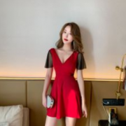 小個子連衣裙女夏季性感短袖深V領露腰修身顯瘦名媛氣質夜場女裝