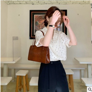 【現貨】2021年夏新款韓國東大門西裝翻領波點短款直筒襯衫女上衣