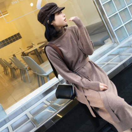 秋冬新款復(fù)古中長(zhǎng)款毛衣裙寬松收腰高領(lǐng)打底針織連衣裙子女