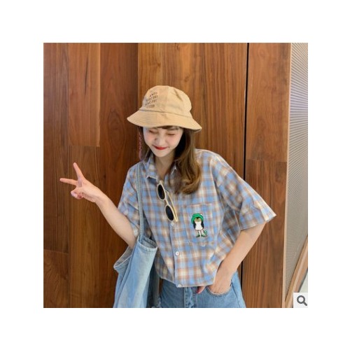 2021夏裝新款夏季學院風格子短袖上衣學生文藝棉麻寬松襯衫外套女