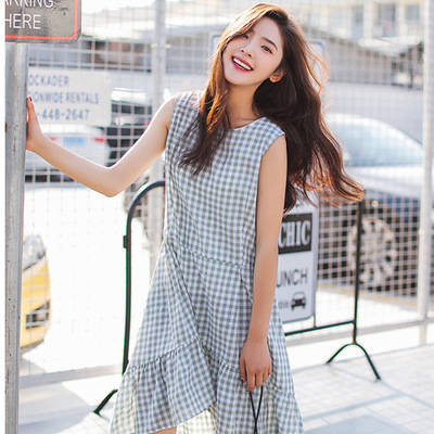 明星倪妮同款2018新款學生韓版小清新無袖荷葉邊格子連衣裙子女夏