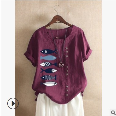 2019亞馬遜wish速賣通爆款女裝卡通印花棉麻短袖寬松休閑襯衣女