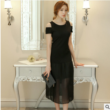 彩黛妃2018春夏新款女裝韓版露肩修身大碼針織雪紡中長款連衣裙女