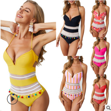 泳衣歐美性感純色露背掛脖泳裝 新款綁帶露背深V連體泳衣女