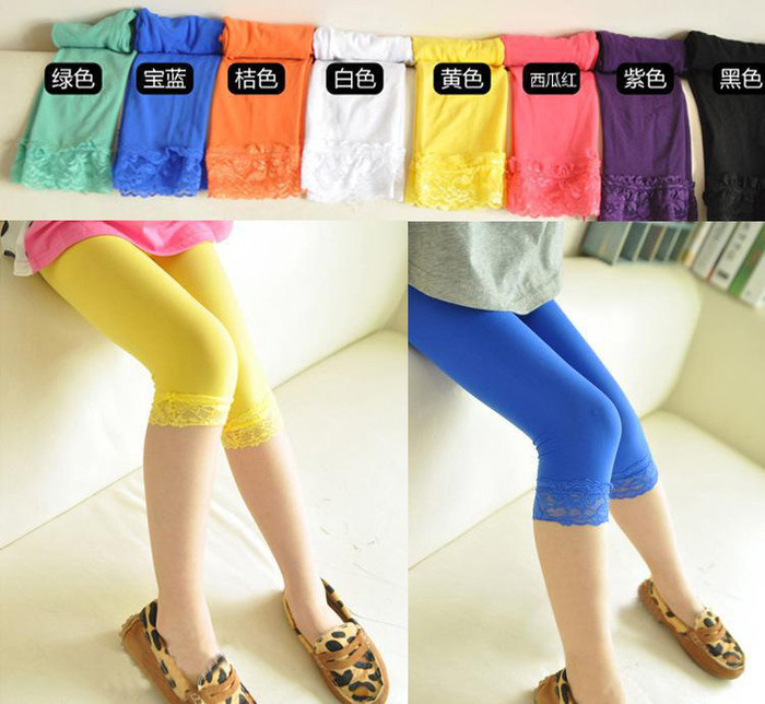 童裝夏款新品兒童蕾絲花邊五七分褲女童糖果色天鵝絨打底褲批11