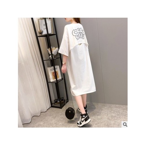 實拍大碼女裝夏季短袖T恤女寬松韓版寬松長款過膝遮肉顯瘦連衣裙