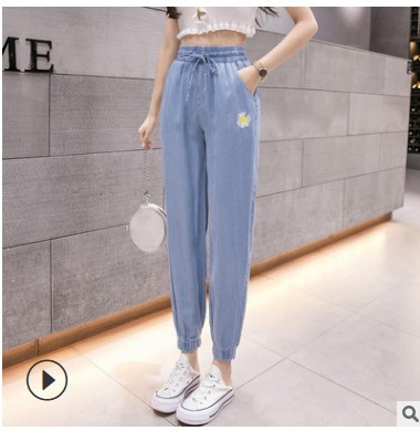 實(shí)拍# 2021夏季薄款寬松雛菊冰絲九分哈倫褲女束腳牛仔休閑褲